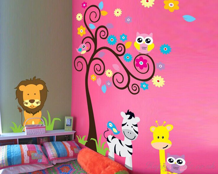This wall decal is about some animal friends with a beautiful flower tree. It is a kind of nursery wall decal in lovely cartoon style.