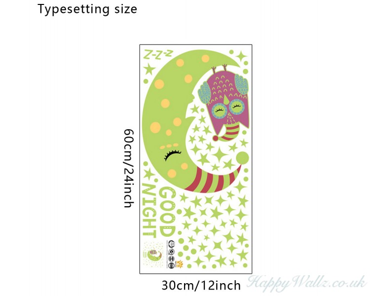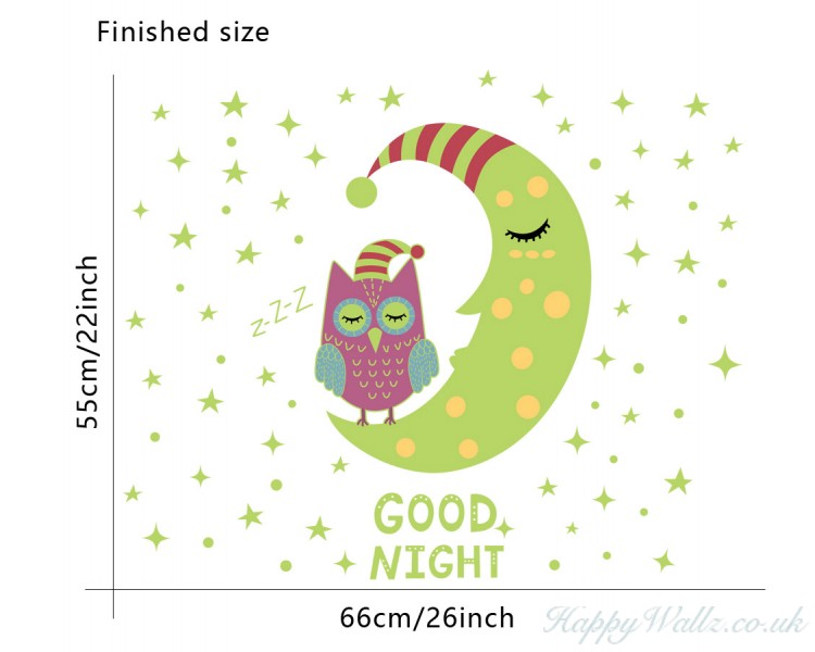 This Owl, Stars and Moon with GOODNIGHT lettering decal pack would be a perfect finishing touch for your baby's nursery or kid’s room. This product needs to absorb light in the daytime,then it will glow automatically in the darkness.
