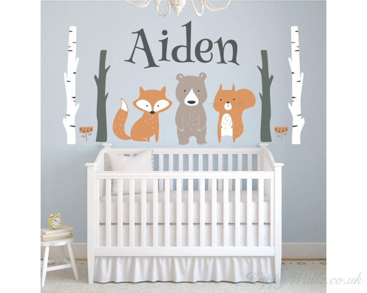 This custom name decal for nursery and kids room is personalized with your child's name with forest cartoon style decor which is a great addition to any nursery or bedroom wall. It is made of the high quality REMOVABLE, indoor matte-finish vinyl that looks as though an artist painted it.