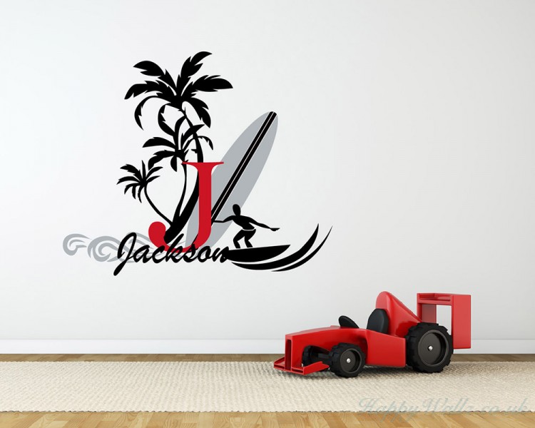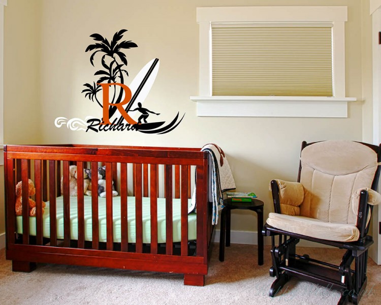 Cool vintage styled surfer wall decal with custom name and monogram letter. Great for teen girls or nursery or any beachy decor theme. Could do a family last name as well for a fun beach house wall decor.