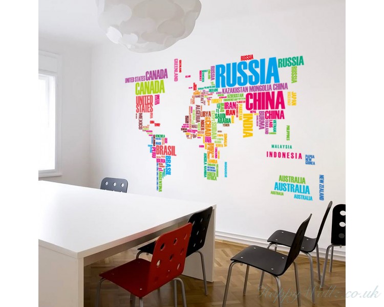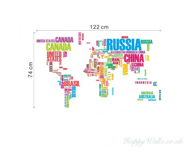 World Map in Country Names Vinyl Wall Decal is a high quality Wall decal with a finished size of 122cm wide x 74cm high. It will be easy to apply on any dry and smooth surface. Wall decal is new way of improving your home decoration. No harm to your walls, easy to apply, you can replace new decals at anytime you like. A nice Wall Decal can change the atmosphere, refreshing a room's look, even improve your mood.